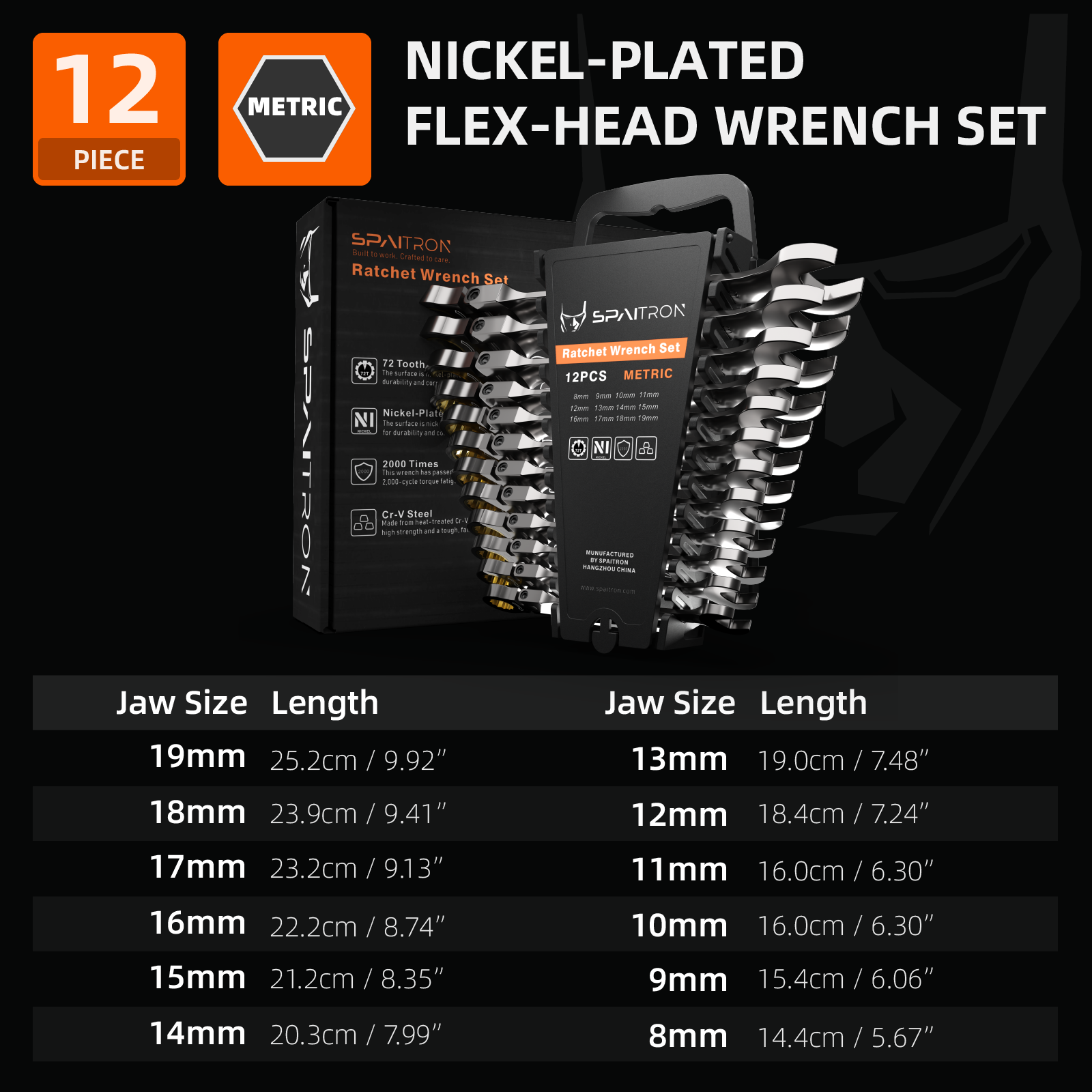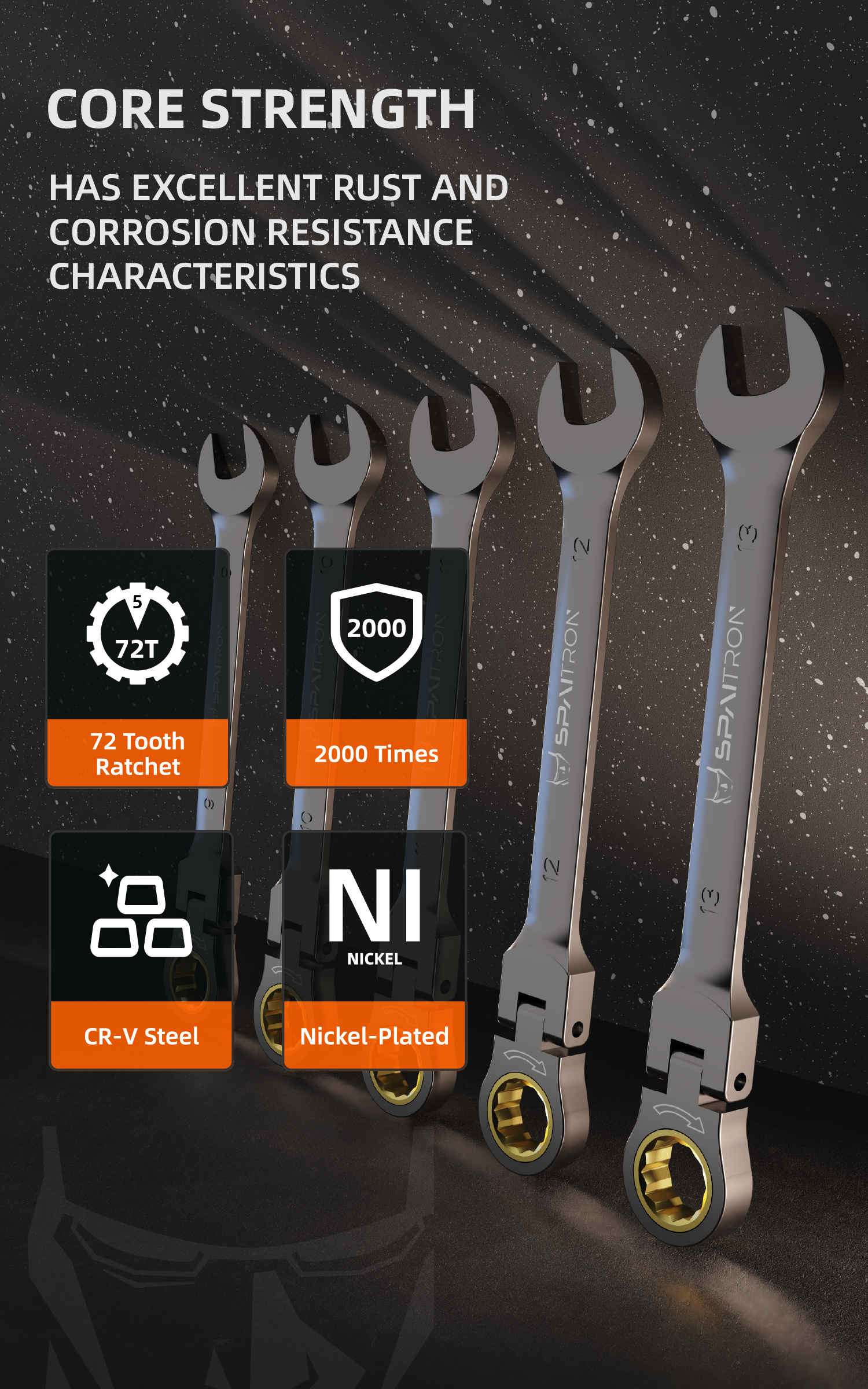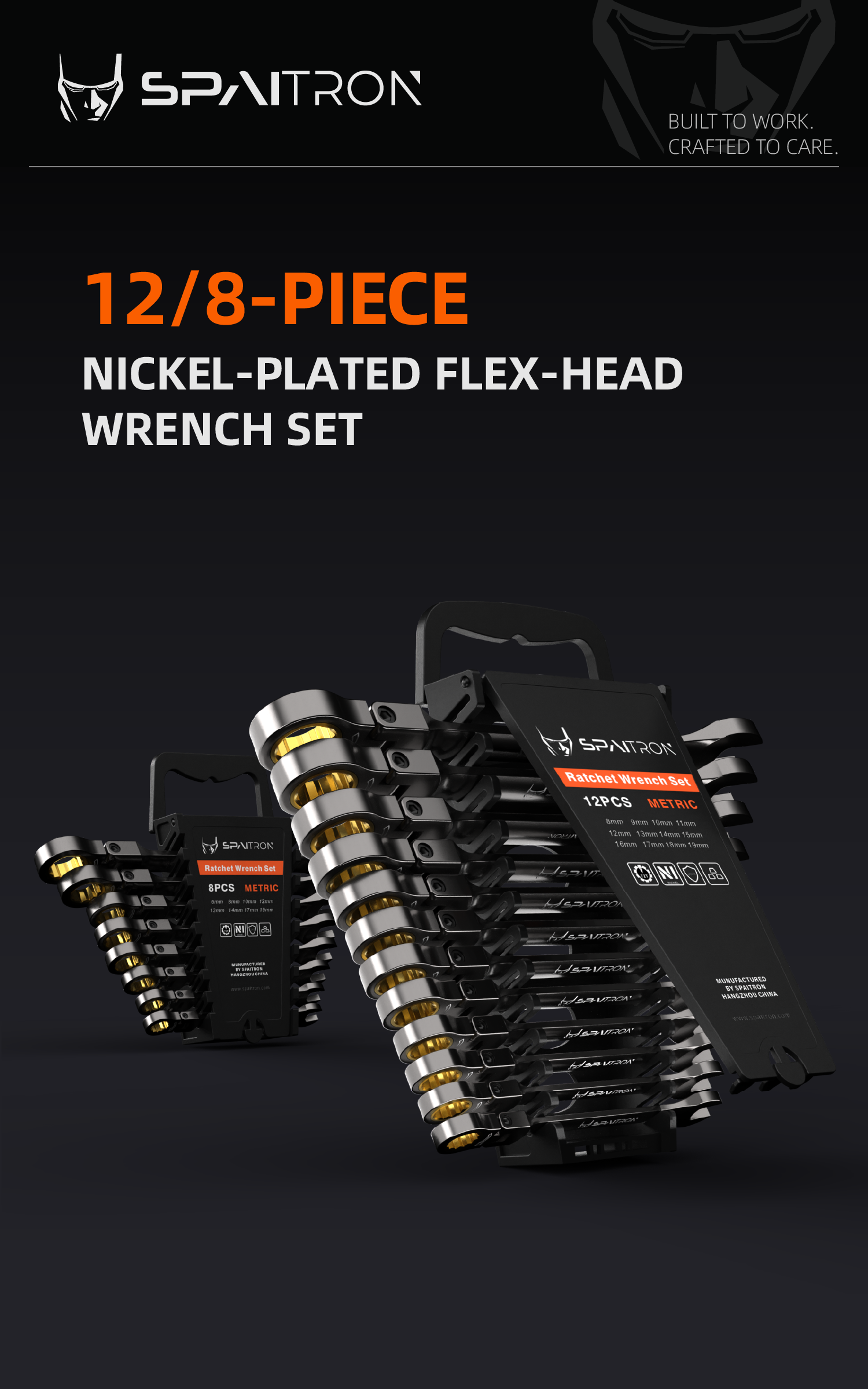 Upgrade your toolbox with the SPAITRON Heavy Duty Flex-Head Ratchet Spanner Set. Available in 12-Piece and 8-Piece professional sets, these tools combine precision engineering with premium durability for car engines, furniture assembly, and DIY projects.
