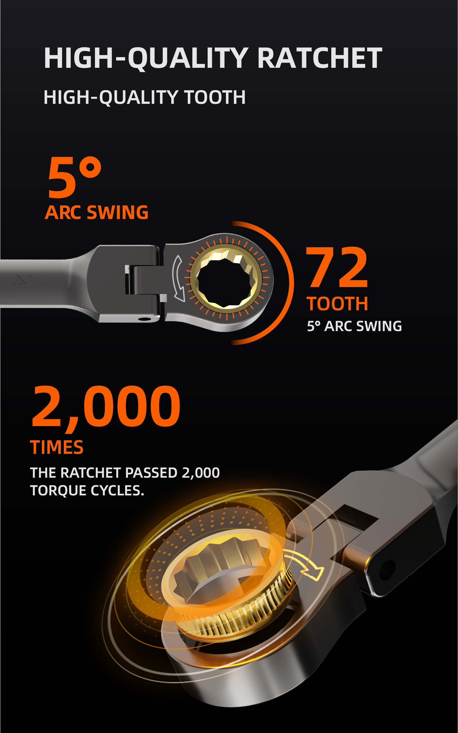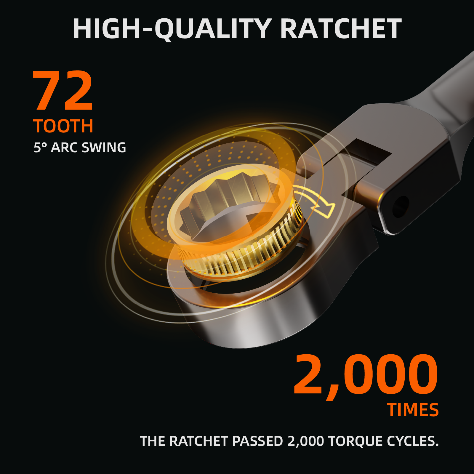 🔧 72-Teeth Precision Gear: Equipped with a high-torque ratchet that requires only a 5° swing arc, providing maximum efficiency in cramped engine bays or tight corners.