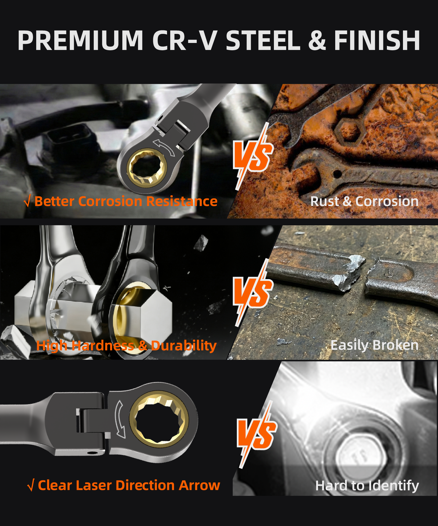 🔄 180° Pivoting Flex-Head: The flexible head smoothly swivels through 180 degrees, allowing you to reach the most awkward bolts and fasteners at any angle—places where a standard rigid wrench simply cannot fit.