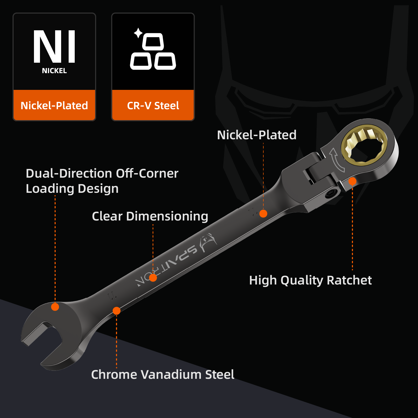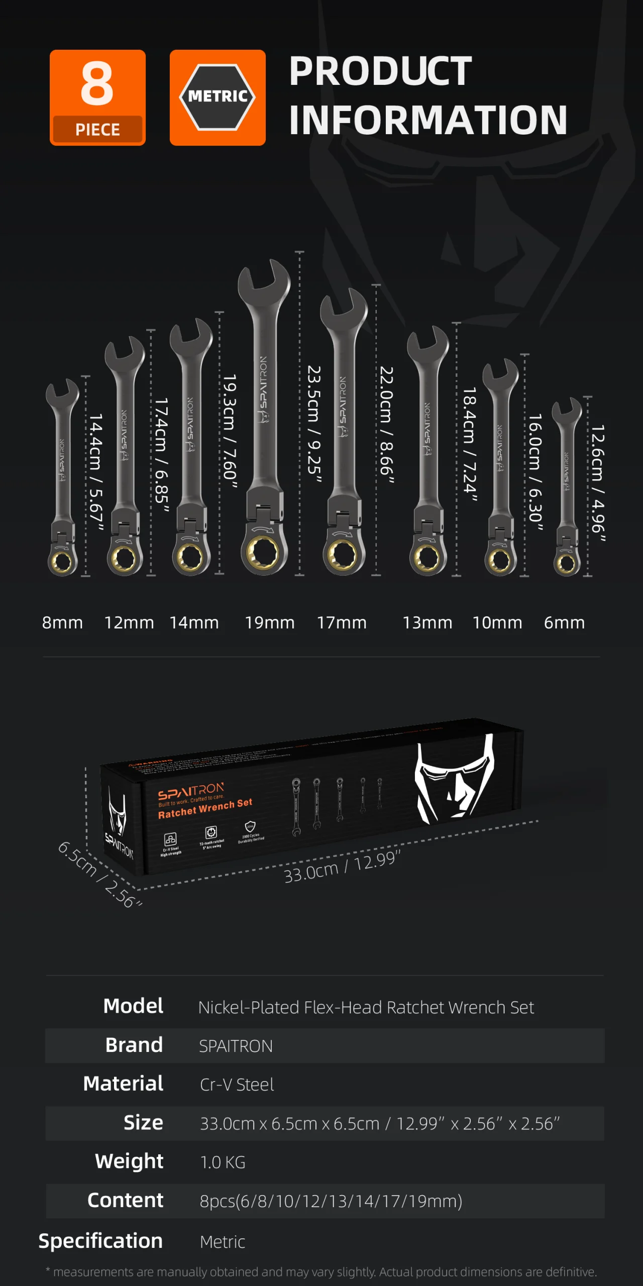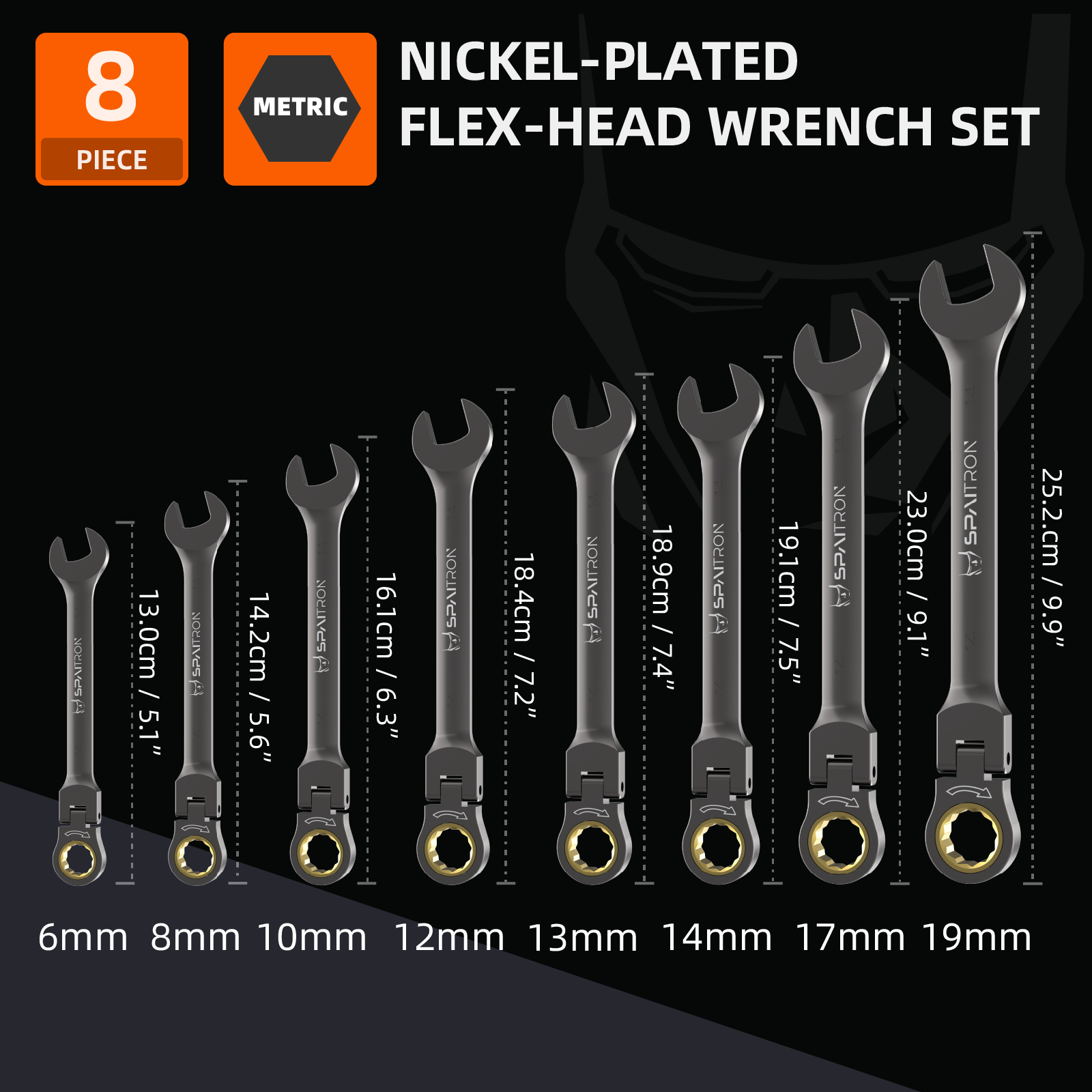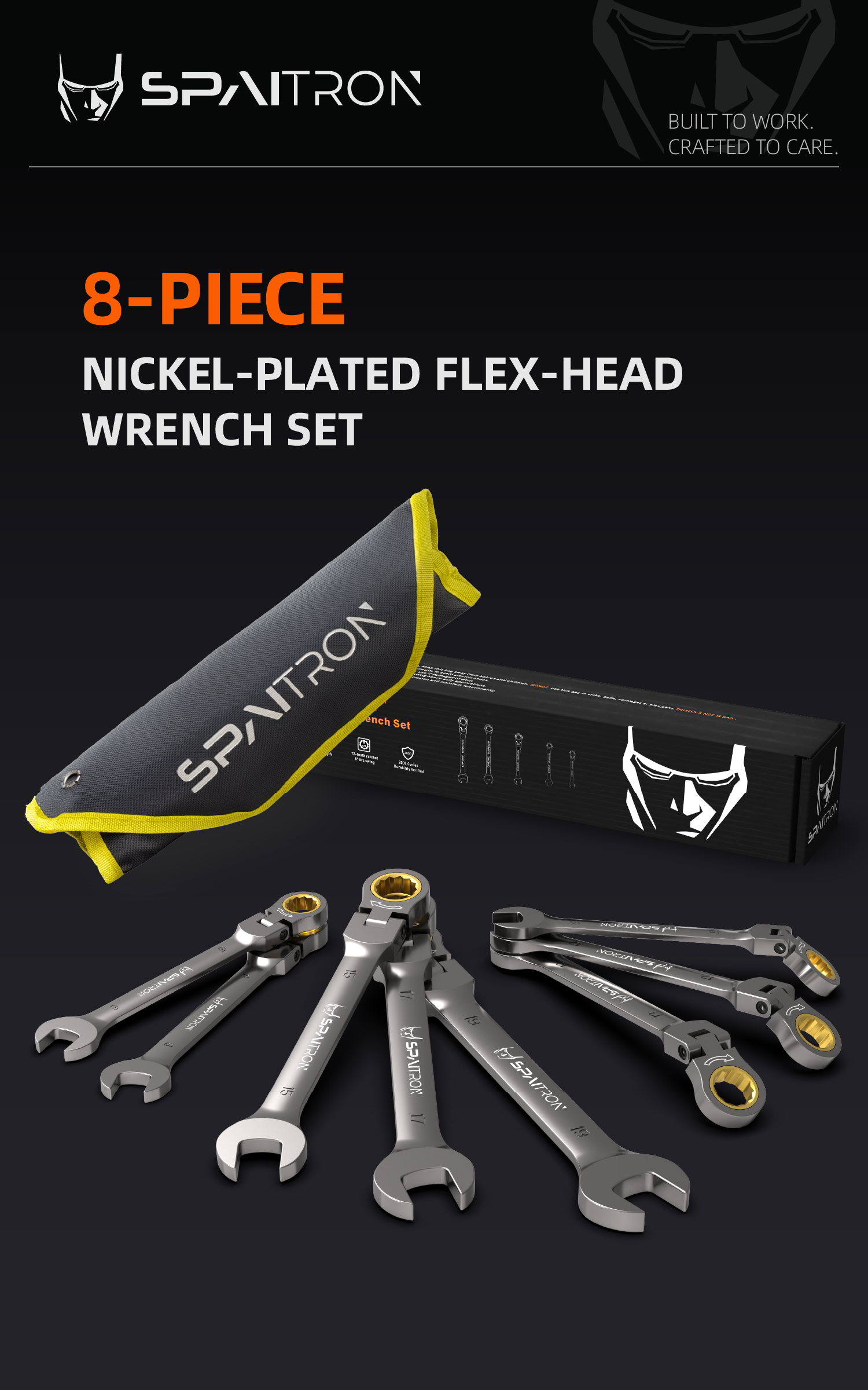Upgrade your toolbox with the SPAITRON 8-Piece Flex-Head Ratchet Spanner Set. Designed for versatility, this set features a pivoting head that adapts to any angle, combining professional precision with premium durability. Whether you are fixing a car engine in a tight spot or assembling furniture, SPAITRON gets the job done.