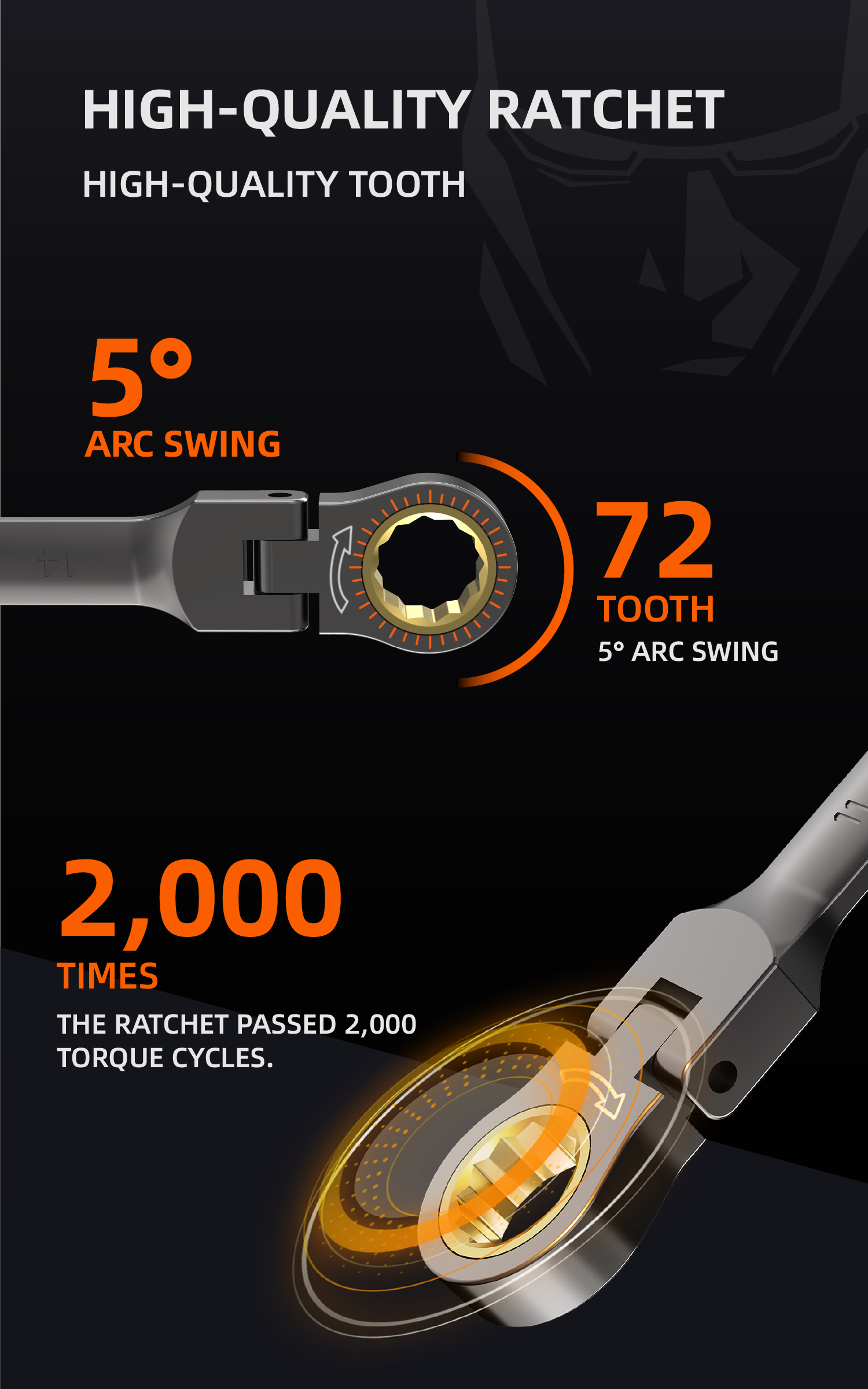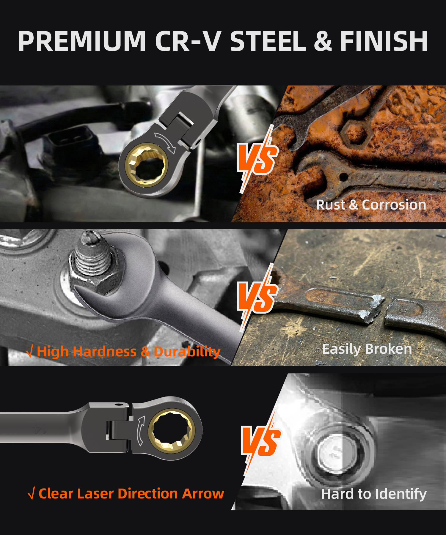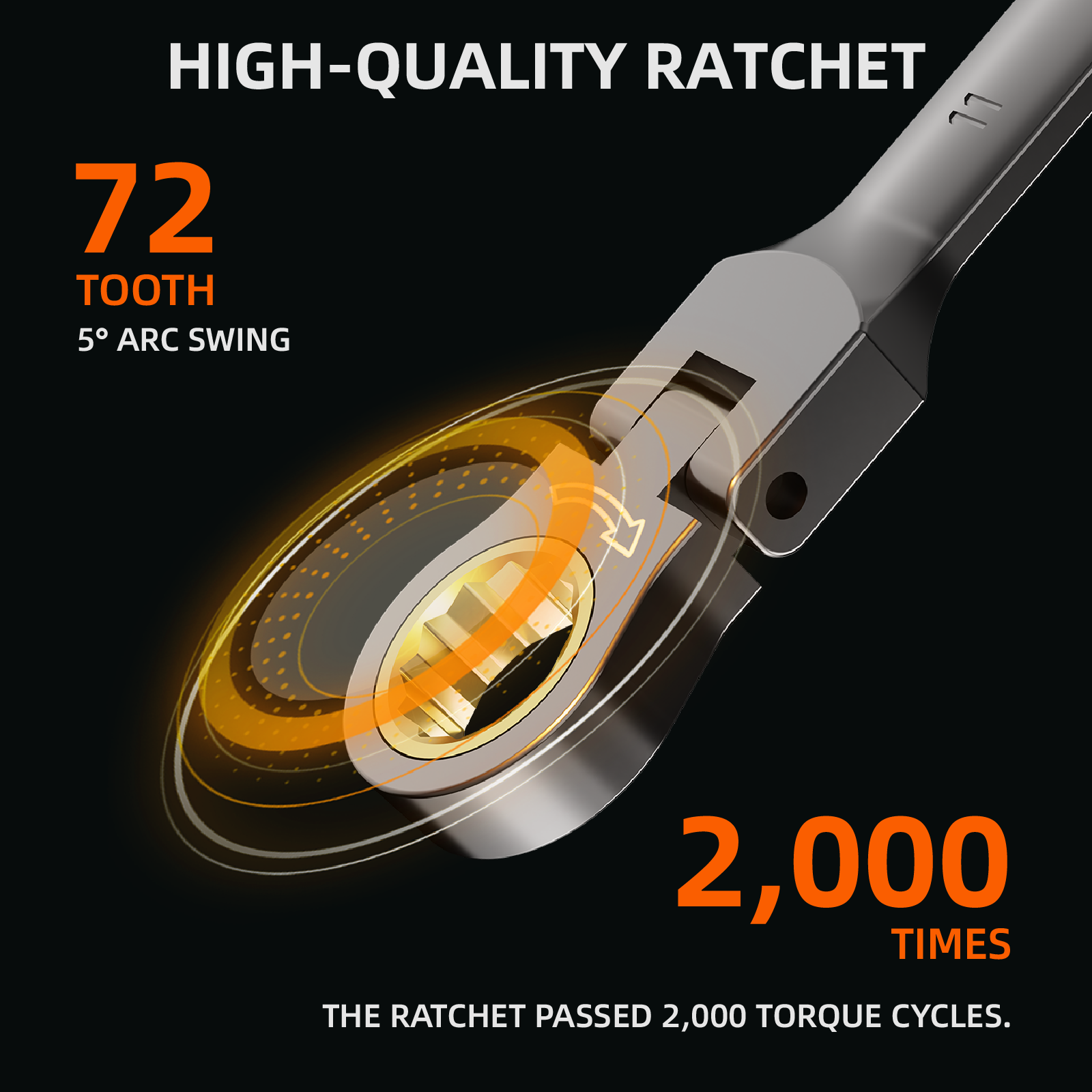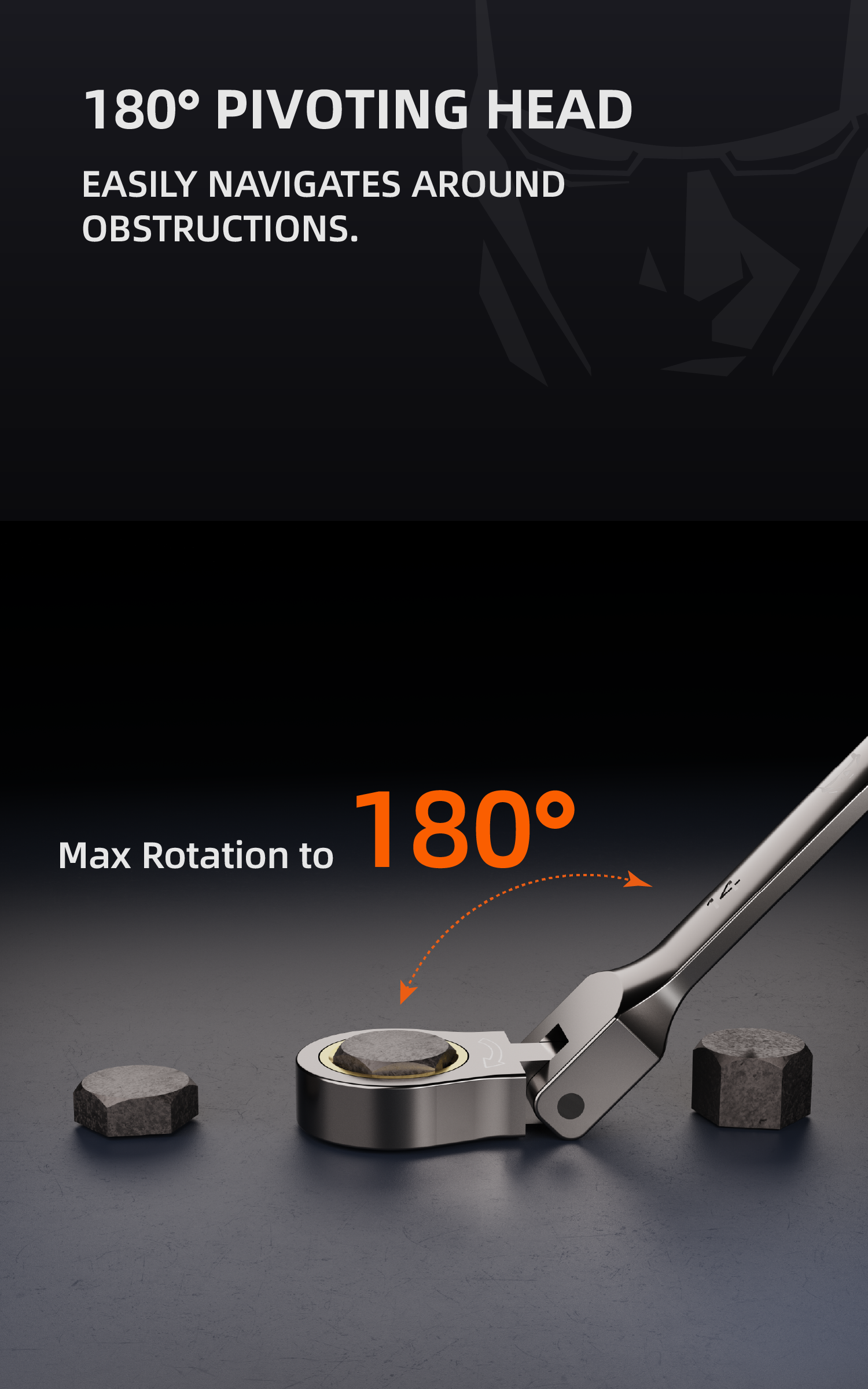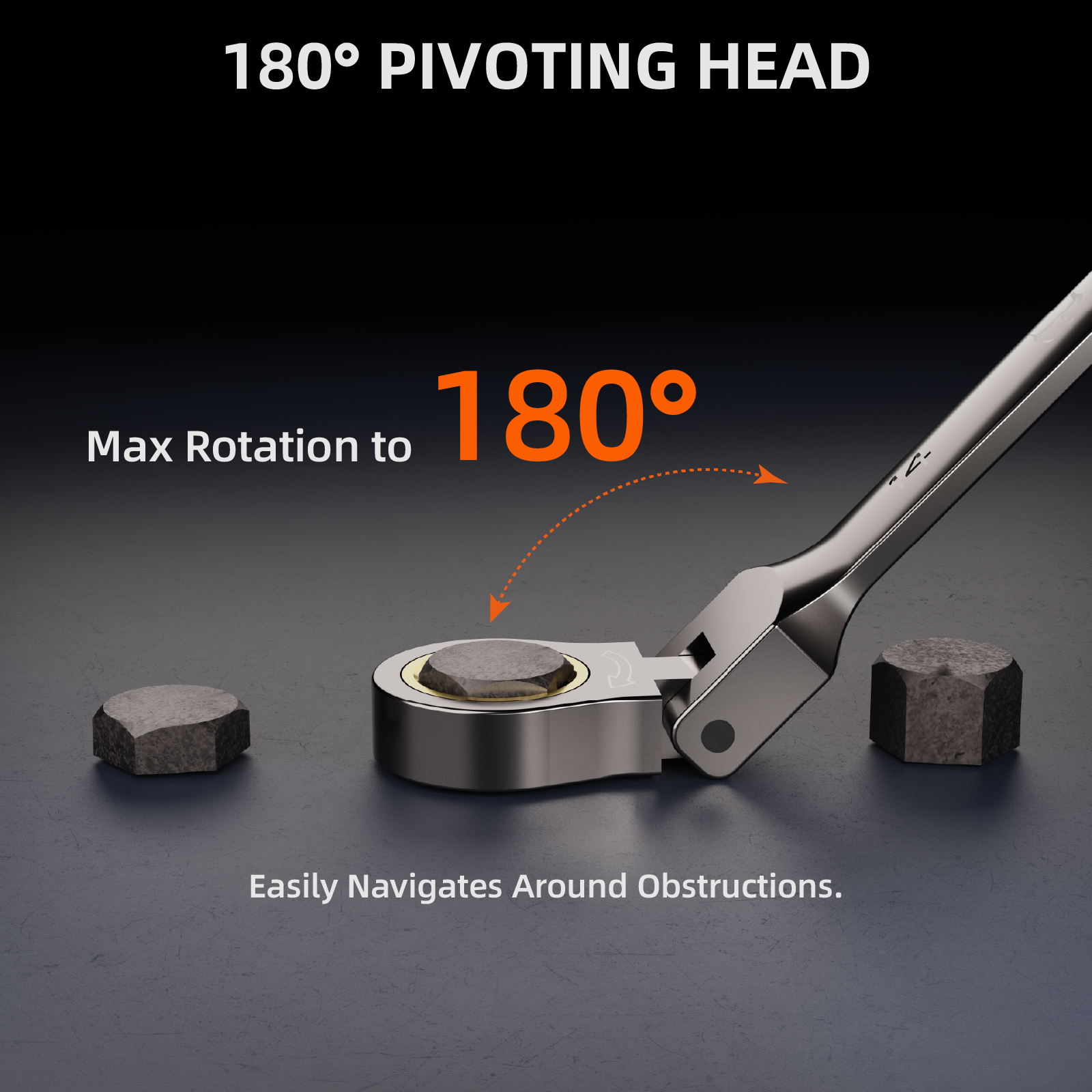 - 🔄 180° Flex-Head Design: The pivoting head smoothly rotates 180 degrees, allowing you to bypass obstacles and reach fasteners at awkward angles. It is the perfect solution for confined spaces where standard flat wrenches simply cannot fit.