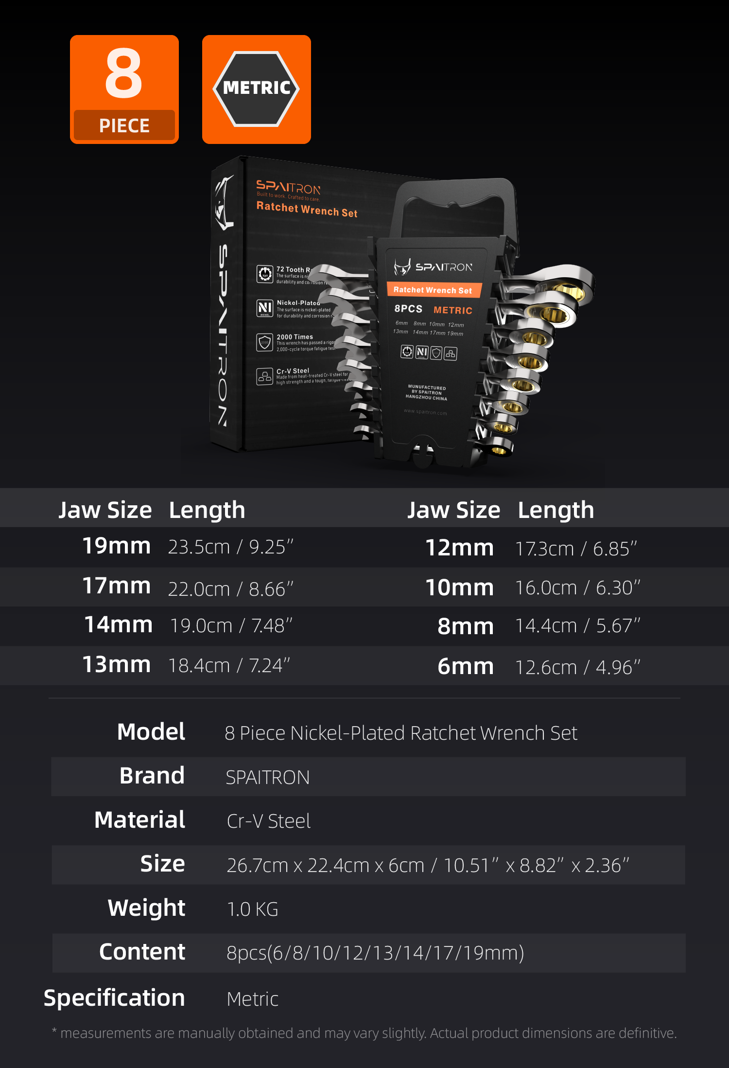Werte deine Werkzeugkiste mit dem SPAITRON Hochleistungs-Ratschenschlüsselsatz auf. Erhältlich als 12-teilige und 8-teilige Profi-Sets, kombinieren diese Werkzeuge Präzisionstechnik mit erstklassiger Haltbarkeit für Automotoren, Möbelmontage und Heimwerkerprojekte.